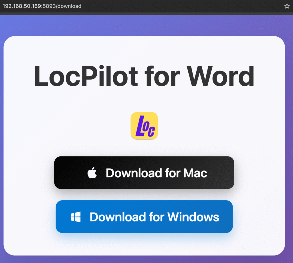 3. Pass the URL of the Download Center to end users. Users can download LocPilot for Word from the URL (e.g. http://192.168.50.169:5893/download, as shown above).